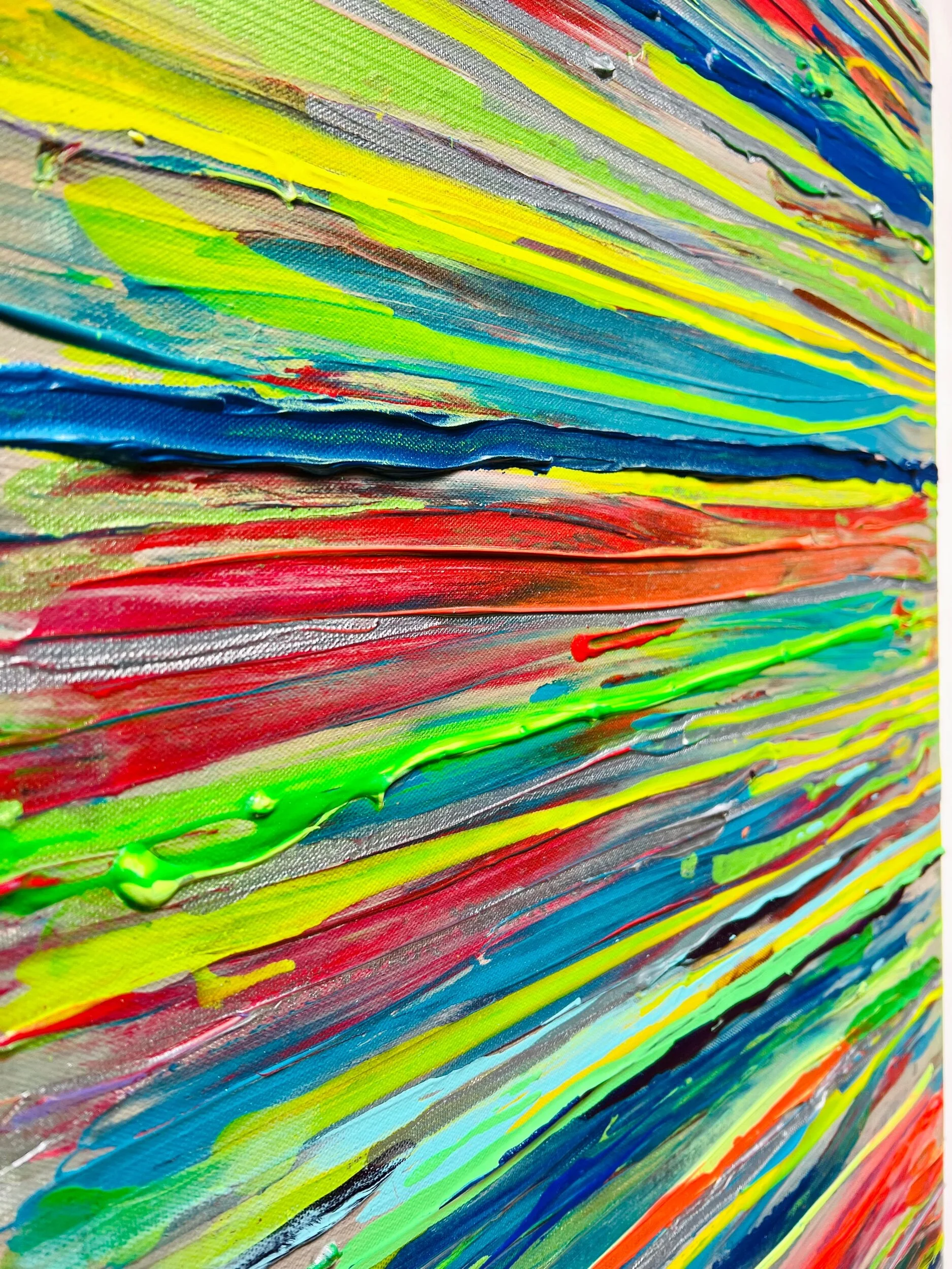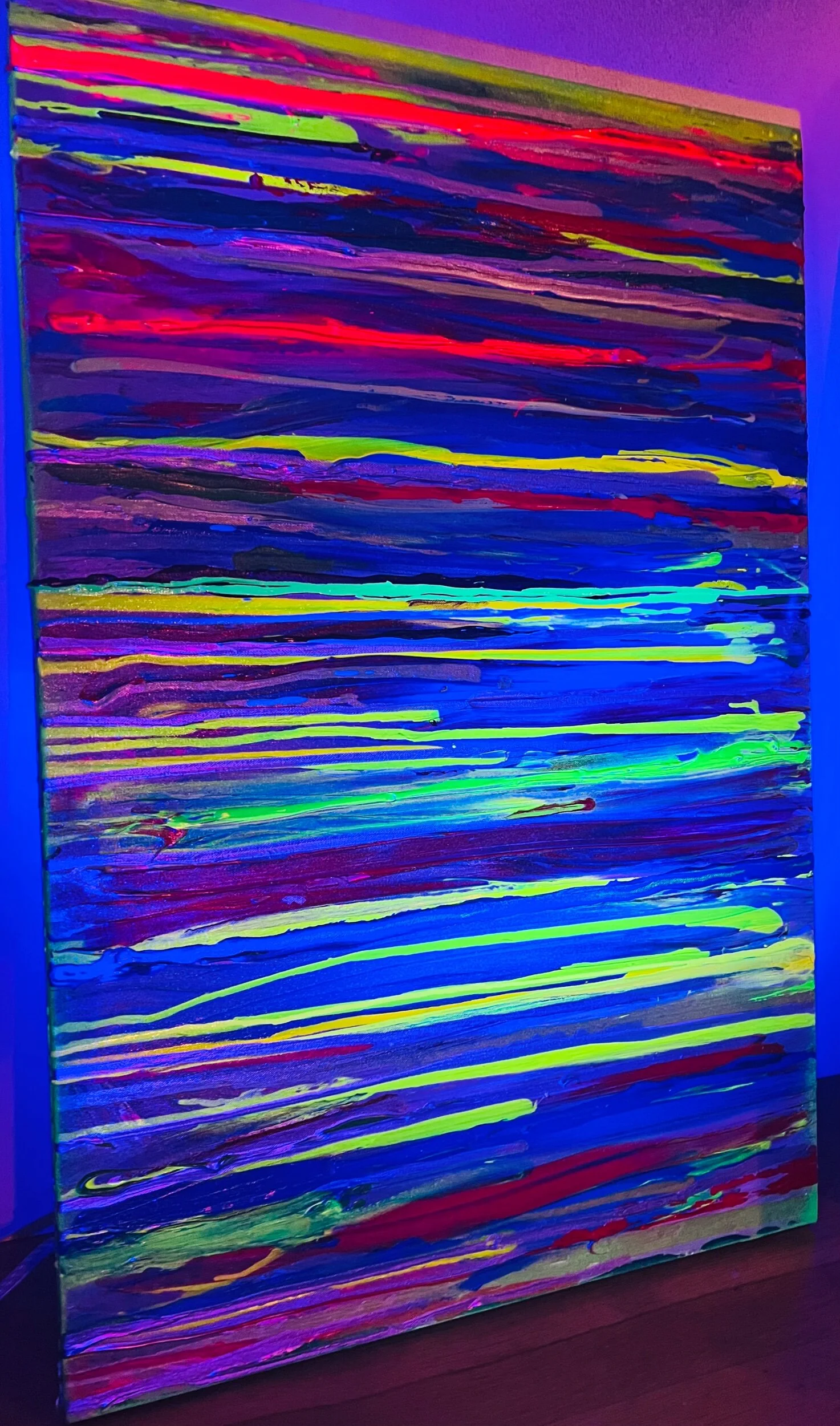 After the astounding feedback from my original artwork titled Chop Stix, I decided to create a series of Stix pieces. For the second Stix Series abstract painting, I envisioned a smaller piece with more of a minimalist vibe. To accomplish this, I blended fewer colors across multiple tones. As I continued to layer the different hues, I was reminded of glow in the dark bracelets that fly across the night sky at Phish concerts. The primary colors consist mostly of neon green, blue, red, and yellow. The tradition has carried on over the years and is truly an eye opening experience.